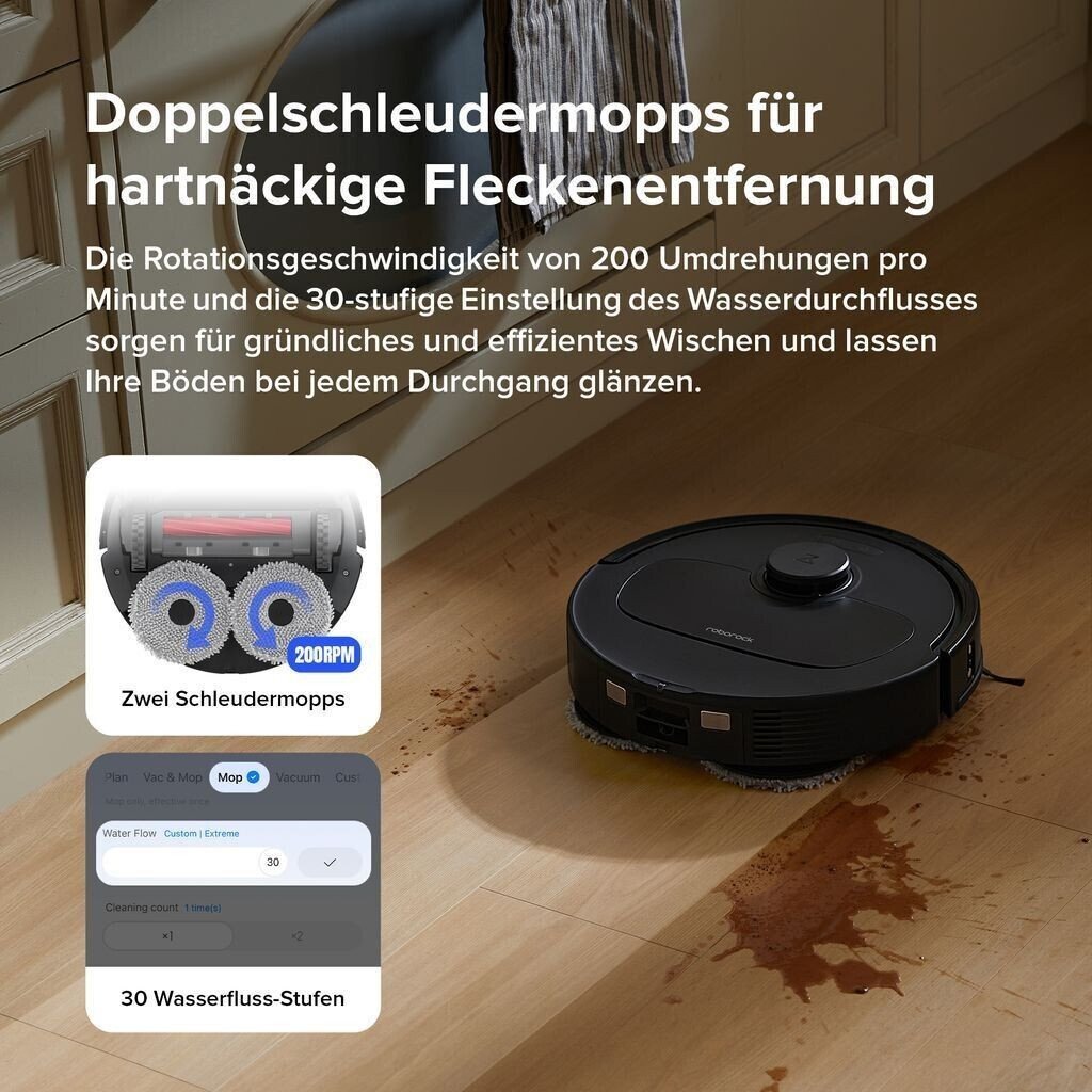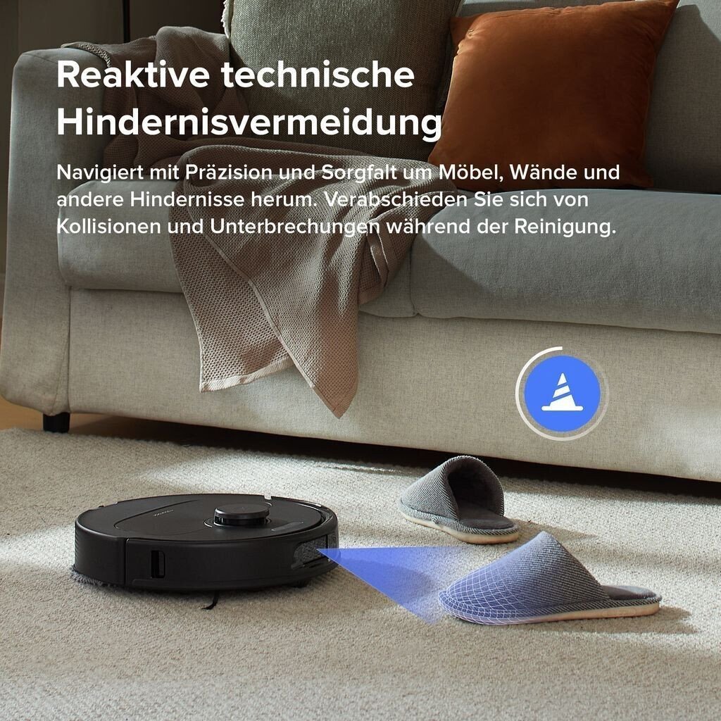 Navigation: Hindernissensor, Ultraschallsensor (Ultraschall Teppicherkennung), Lasersensor (LiDAR), Sperrzonen, Hinderniserkennung, Hindernisüberwindung, Teppicherkennung (Wischaufsatz-Hebefunktion bis 10mm)
